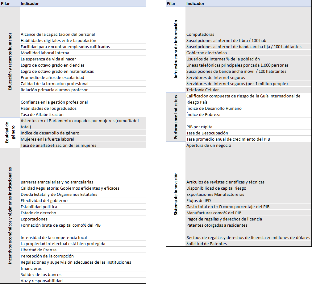 Para su diseño en esta edición se utilizaron 6 pilares y un total de 59 indicadores, que son los siguientes: