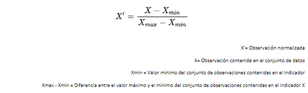 En donde el valor máximo (1) lo obtiene el país con el valor más alto para cada indicador, mientras que el valor mínimo (0) lo obtiene el país con el valor más bajo para dicho indicador.