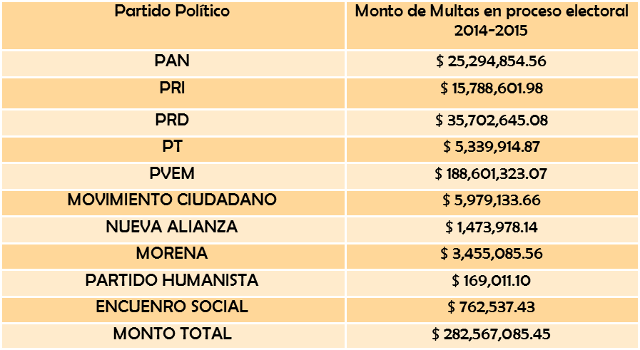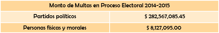 Durante el proceso electoral 2014-2015 se establecieron diversas sanciones, al mes de septiembre se habían pagado los siguientes montos por infracciones al marco jurídico electoral: