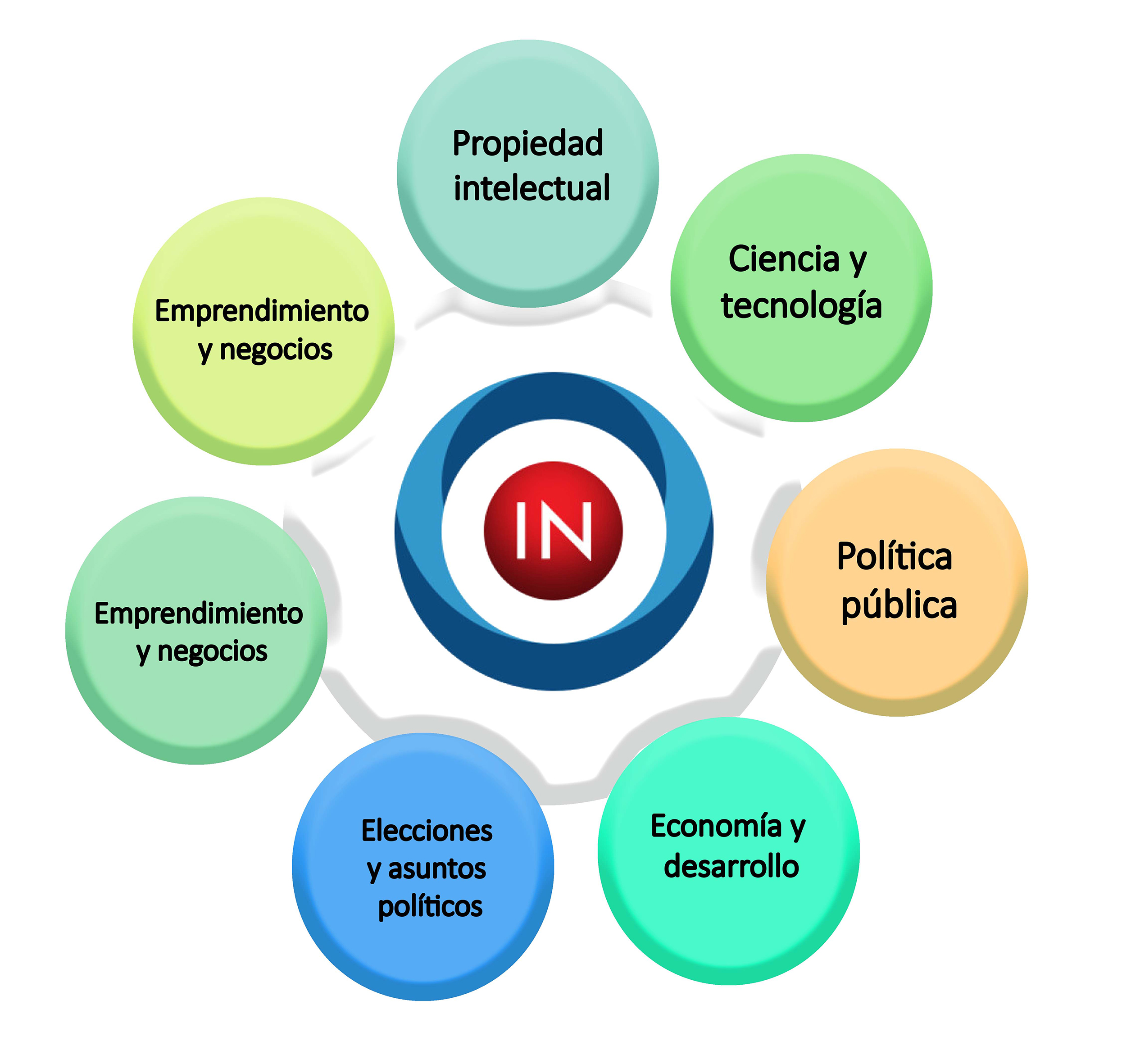 A través de un tema central que es la innovación, respaldaremos, identificaremos y proporcionaremos ideas y asesoría para resolver problemas en 7 áreas generales: propiedad intelectual; ciencia y tecnología; política pública; economía y desarrollo; elecciones y asuntos políticos; derechos humanos; y negocios y emprendedurismo (esto lo podríamos hacer en imagen, como infografía)