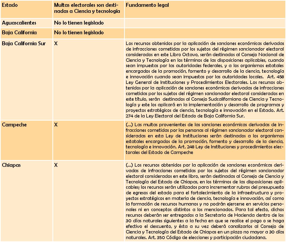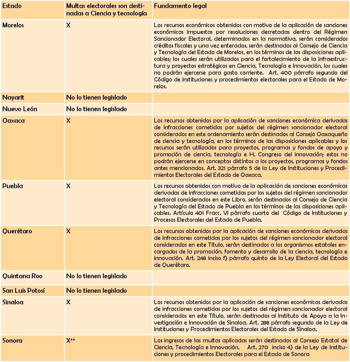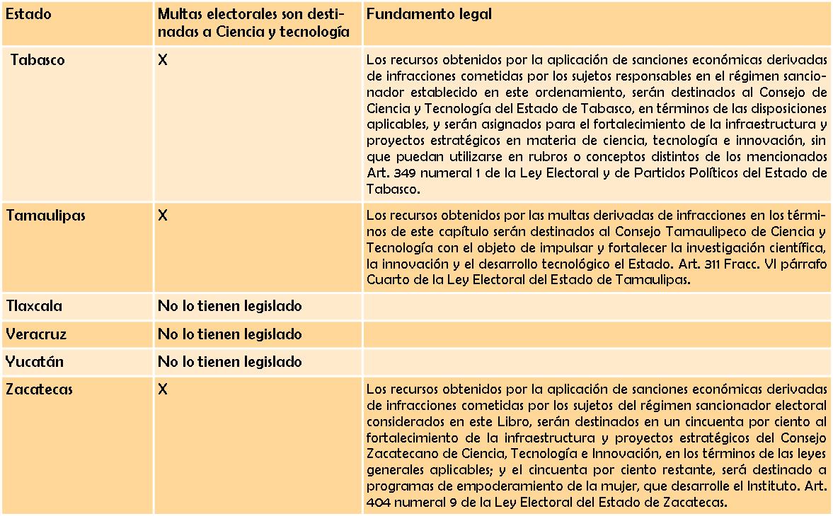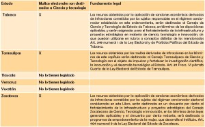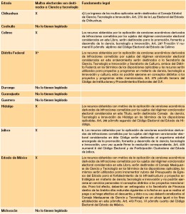 Como se expuso previamente, aunque el artículo 458 de la Ley General de Instituciones y Procedimientos Electorales determina el recurso de las multas pueden ser enviadas a los Estados, en caso de que no se haya legislado a nivel Estatal al respecto el recurso se enviará al CONACyT. Es por ello que a través de la siguiente tabla de muestran los que han legislado en este sentido: